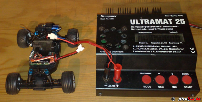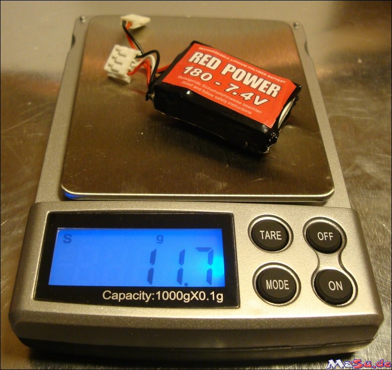 Für die Stromversorgung verwende ich einen 2S 180mAh – LiPopack, der mit etwas pressen genau in de Akkuschacht passt. Dieser Akku hat richtig Druck und eine sehr langer Fahrzeit.